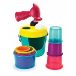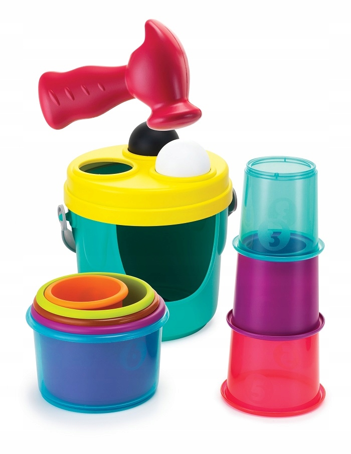 W zestawie: wiaderko z pokrywką, 9 kubeczków o różnych rozmiarach (każdy kubeczek z inną cyferką, najmniejszy w kształcie głowy żyrafy), 2 piłeczki oraz młotek do wbijania piłeczek przez otwory wiaderka.