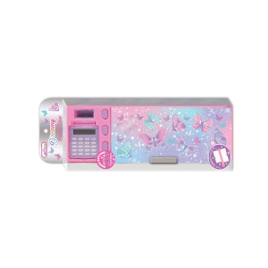 Piórnik zawiera dwie zamykane komory na przybory szkolne, jedną szufladkę, 1 mini-pojemnik, wysuwany podstawowy kalkulator, wysuwaną temperówkę.