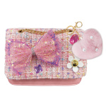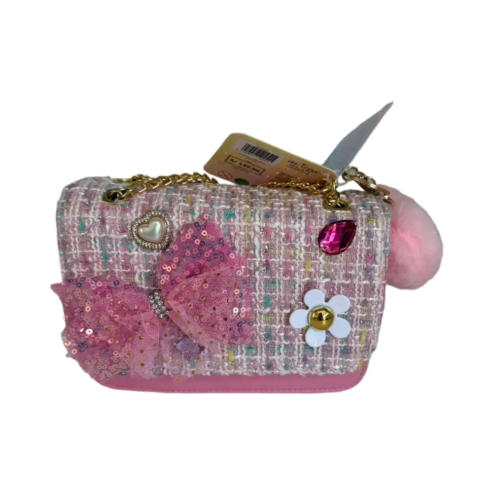 Elegancka torebka typu crossbody z tweedu ozdobiona kokardą z cekinów, zawieszką (pluszowym brelokiem) w kształcie serca i łańcuszkiem. Kwiatowe akcenty i zabawne detale nadają jej stylowy i fantazyjny wygląd. Pomieści niezbędne akcesoria małej miłośniczki mody i trendów. Idealna na imprezy, jako prezent lub na co dzień. Zapinana na magnetyczny zatrzask.