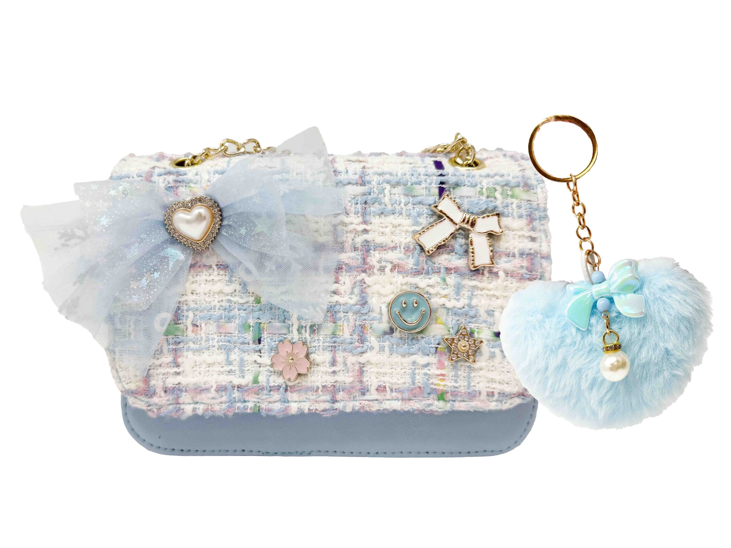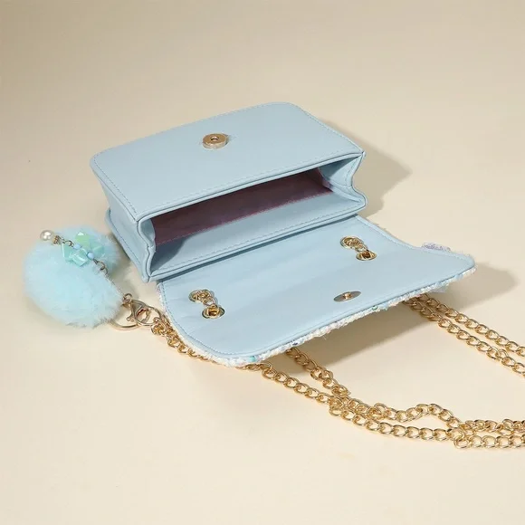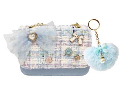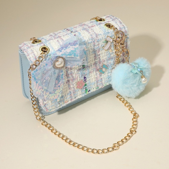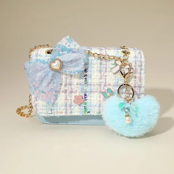 Elegancka torebka typu crossbody z tweedu ozdobiona kokardą z cekinów, zawieszką (pluszowym brelokiem) w kształcie serca i łańcuszkiem. Kwiatowe akcenty i zabawne detale nadają jej stylowy i fantazyjny wygląd. Pomieści niezbędne akcesoria małej miłośniczki mody i trendów. Idealna na imprezy, jako prezent lub na co dzień. Zapinana na magnetyczny zatrzask.