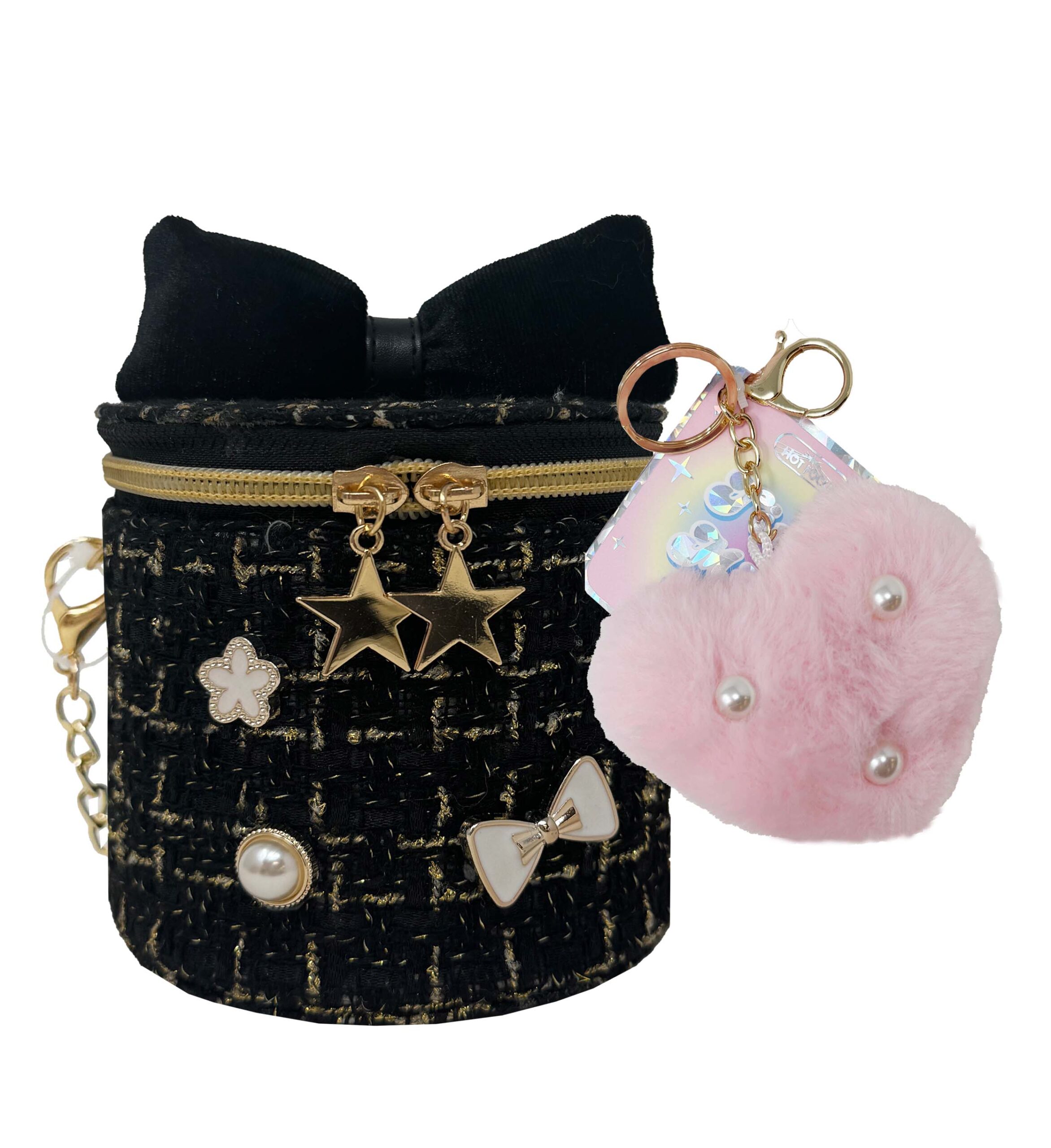 Torebeczka pomieści niezbędne akcesoria małej miłośniczki mody i trendów. Wykonana z materiału tweed i ozdobiona mnóstwem akcesoriów. Dołączony pasujący miękki breloczek dla dodatkowego dekoracyjnego efektu. Torebeczkę można nosić na długim złotym łańcuszku. Zapinana na zamek.
