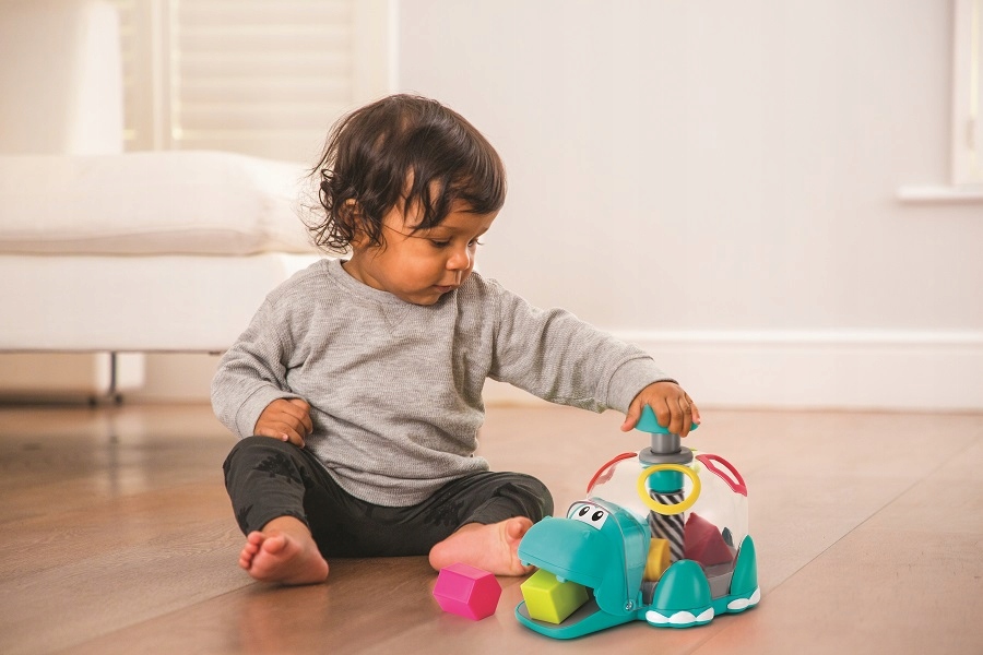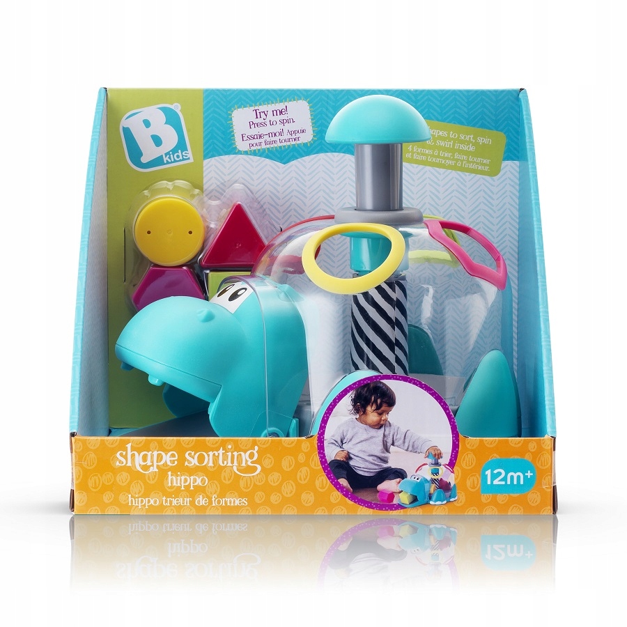Ten wesoły hipopotam to połączenie klasycznego sortera z bączkiem. Klocki można wrzucać do środka przez otwory o odpowiednich kształtach. Po naciśnięciu przycisku klocki będą wirować, a hipopotam otworzy paszczę, przez którą będą one wypadać.