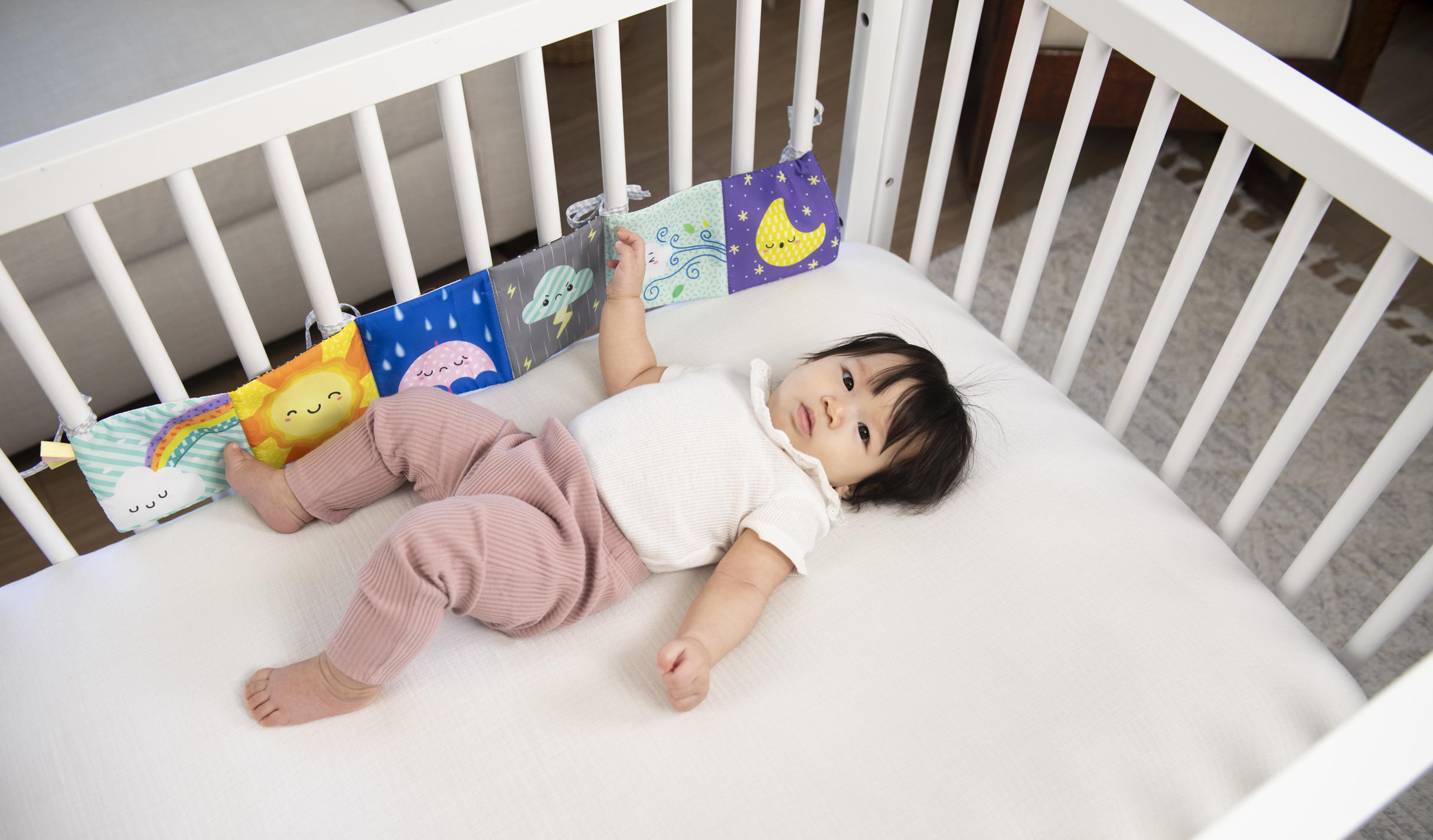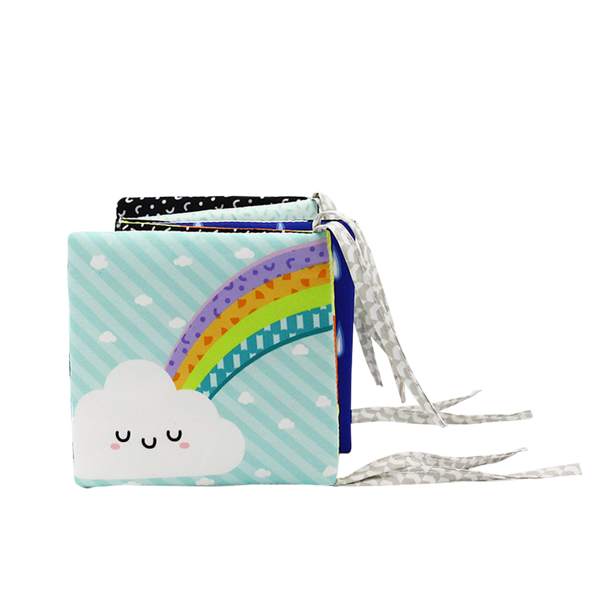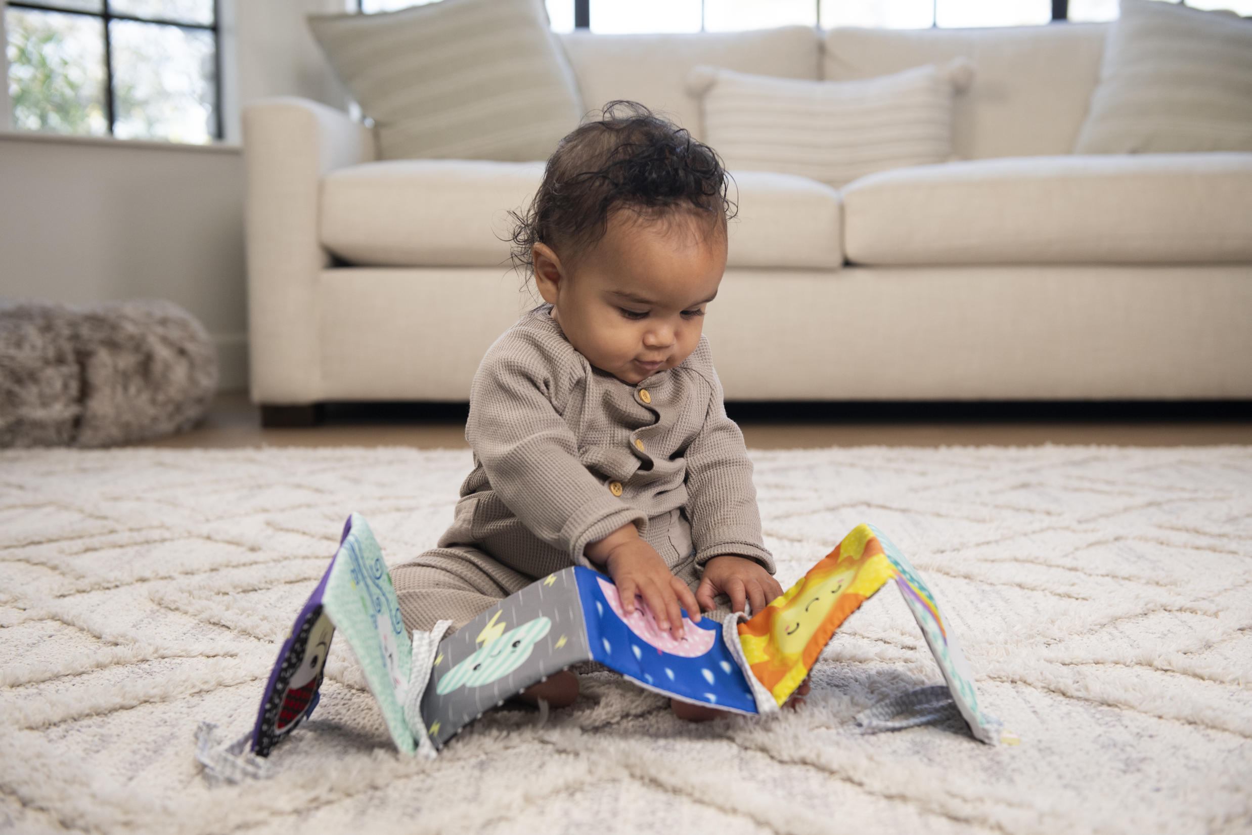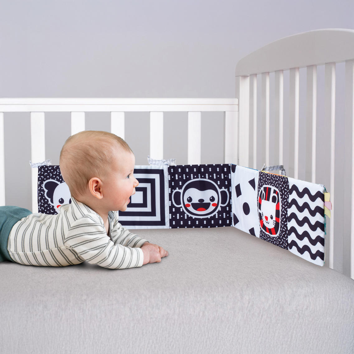 Lekka materiałowa książeczka zaprojektowana z myślą o wspieraniu rozwoju dziecka od pierwszego miesiąca życia.