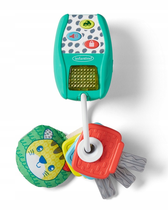 Dzięki różnym fakturom, kolorowe kluczyki mogą posłużyć również jako gryzaczki. Przyciski uruchomią różne dźwięki i jedną wesołą melodię. Przezroczysty przycisk mruga światełkiem w rytm melodii.