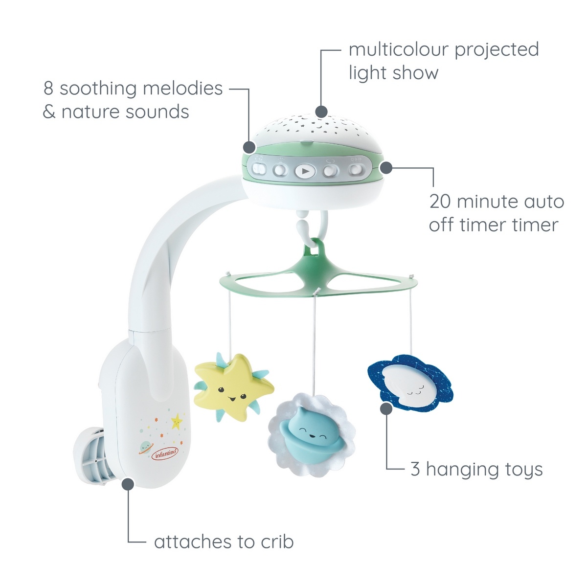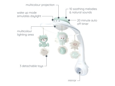 automatyczne wyłączanie, funkcja pozytywki, możliwość odczepiania zabawek, wbudowany projektor |