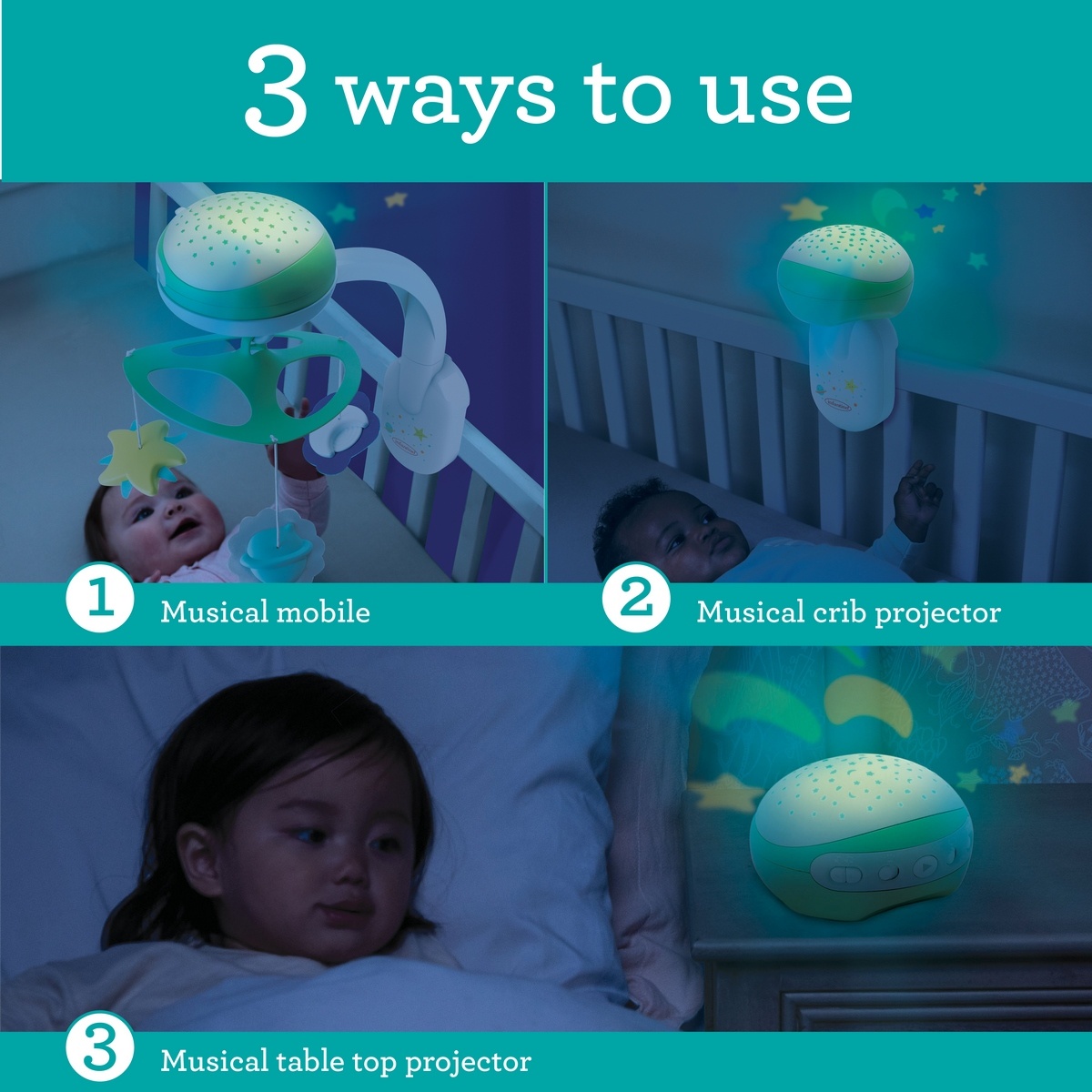 Projektor wyświetla gwiazdki oraz gra kojące melodie, które uspokajają dziecko oraz pomagają mu zasnąć.