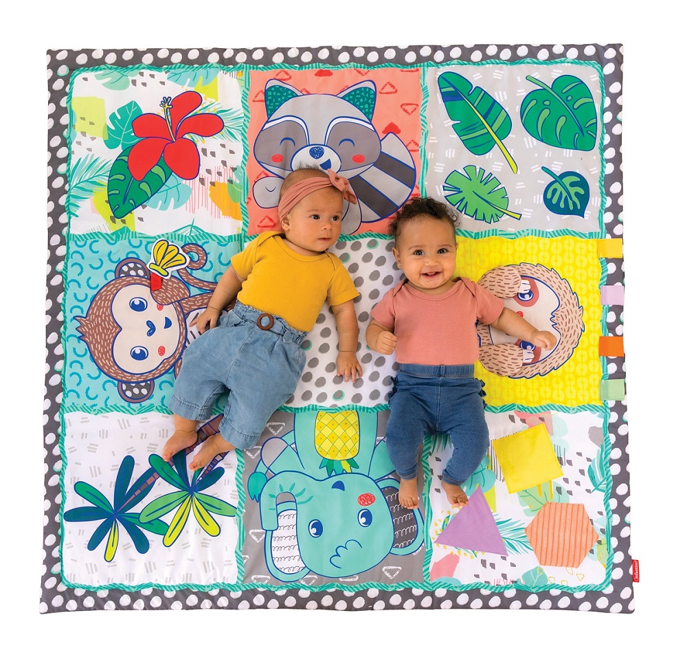 Ta wyjątkowo duża mata do ćwiczeń tworzy bezpieczne, miękkie miejsce do zabawy dla dziecka. Teksturowane tkaniny i szeleszczące elementy zapewniają wczesną integrację sensoryczną, a kontrastowe kolory przyciągają uwagę dziecka i zachęcają do zabawy.