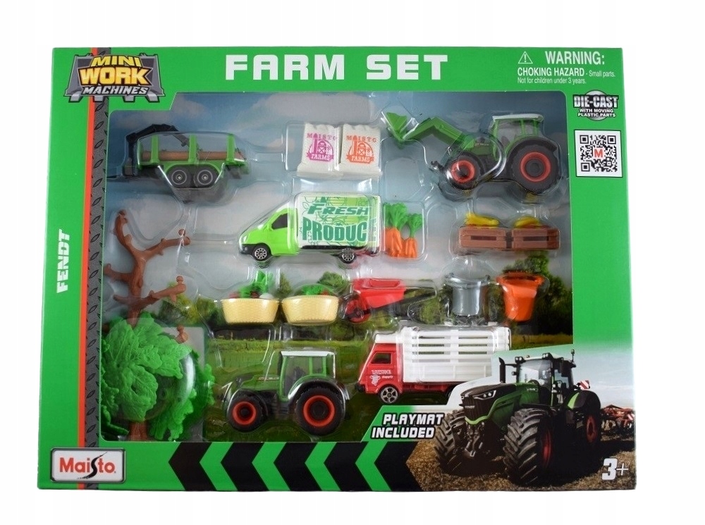 W zestawie: traktor, koparka, przyczepa, samochód dostawczy, ciężarówka, taczka, 2 wiaderka oraz inne akcesoria.