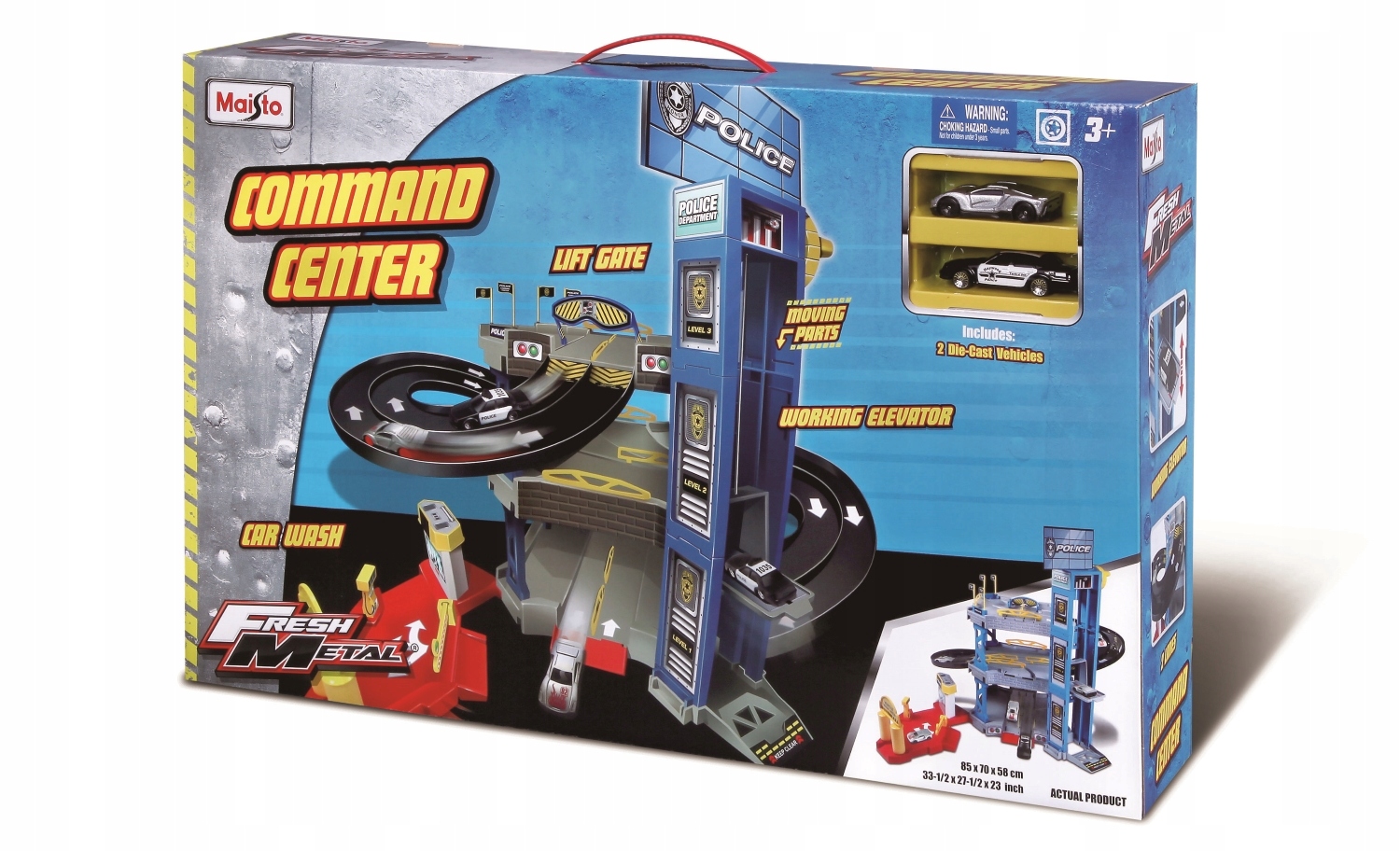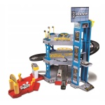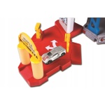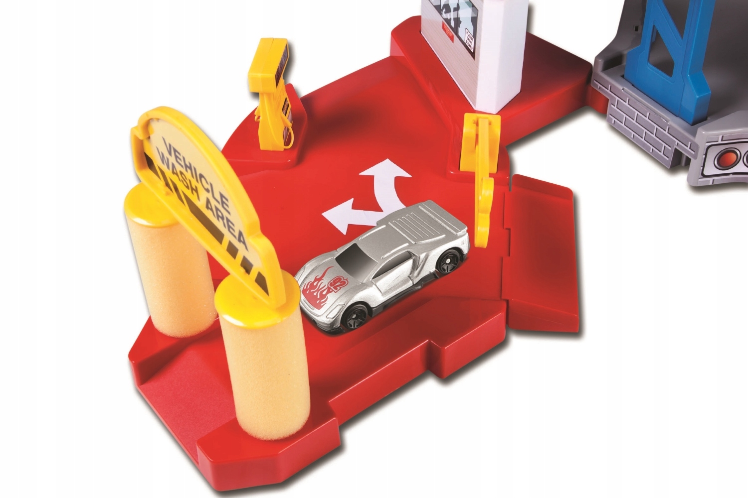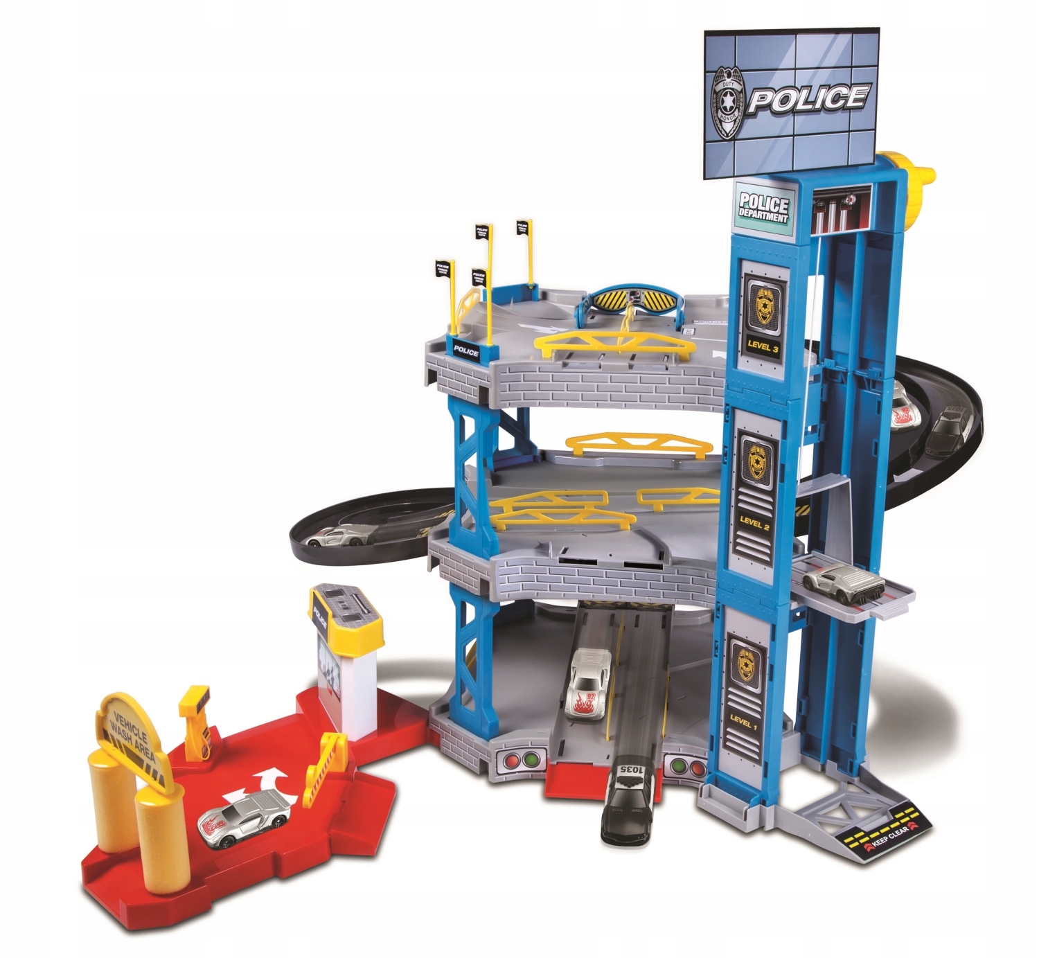 W zestawie zjeżdżalnia z dwoma torami, myjnia samochodowa, trzypiętrowa winda, parking policyjny, arkusze z naklejkami i inne dodatkowe akcesoria.