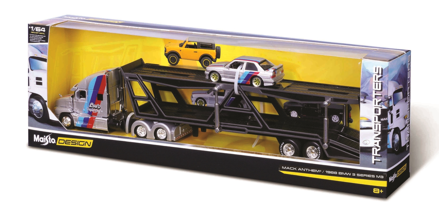 MAISTO Design Transporters Laweta 2-piętrowa Mack Anthem + BMW 3 Series M3 1988