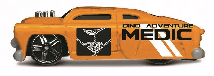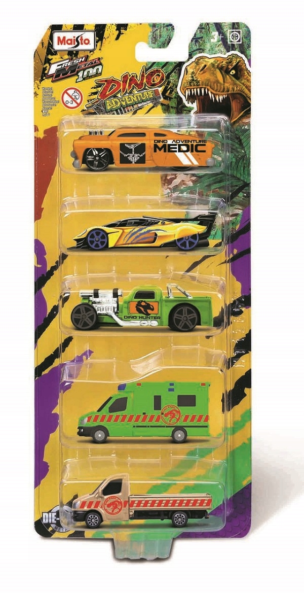 W zestawie pięć różnych modeli samochodów z serii Dino Adventure.