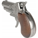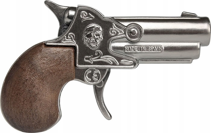 Miniaturowy metalowy pistolet piracki (z elementami z tworzywa) wydający głośny dźwięk po naciśnięciu spustu.