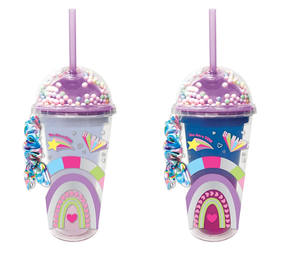 Zakręcany jest wypukłą nakrętką, dzięki której napój się z niego nie wyleje. Pod kopułą nakrętki znajdują się małe przesypujące się kolorowe kuleczki dla dodatkowego dekoracyjnego efektu.