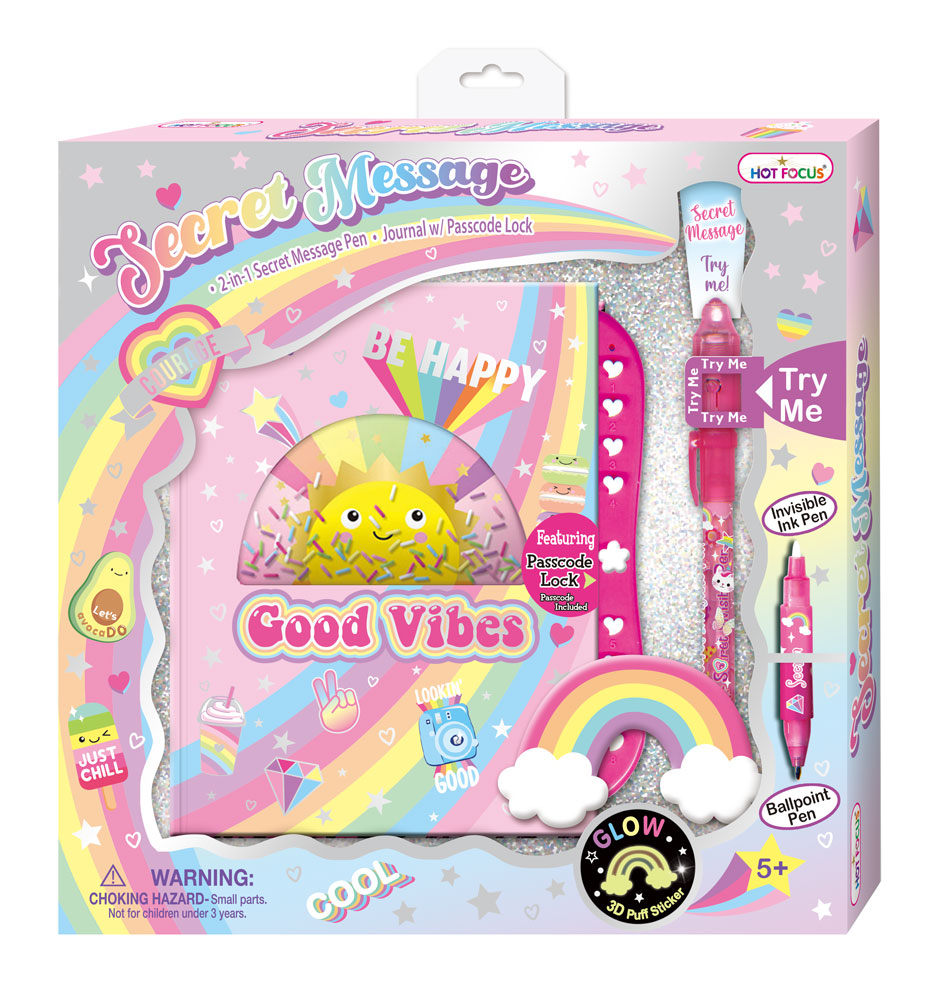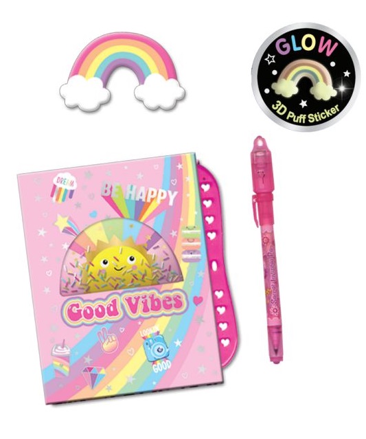 Pamiętnik w linie zamykany na szyfr. Do zestawu dołączony jest długopis z dwoma końcówkami – jedna to tradycyjny długopis do pisania, a druga to ‘niewidzialny tusz’. Zapiski tym tuszem będą widoczne po podświetleniu ich specjalną lampką UV, która znajduje się w zatyczce długopisu. Okładka ozdobiona jest przezroczystm okienkiem z przesypującymi się koralikami.