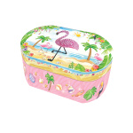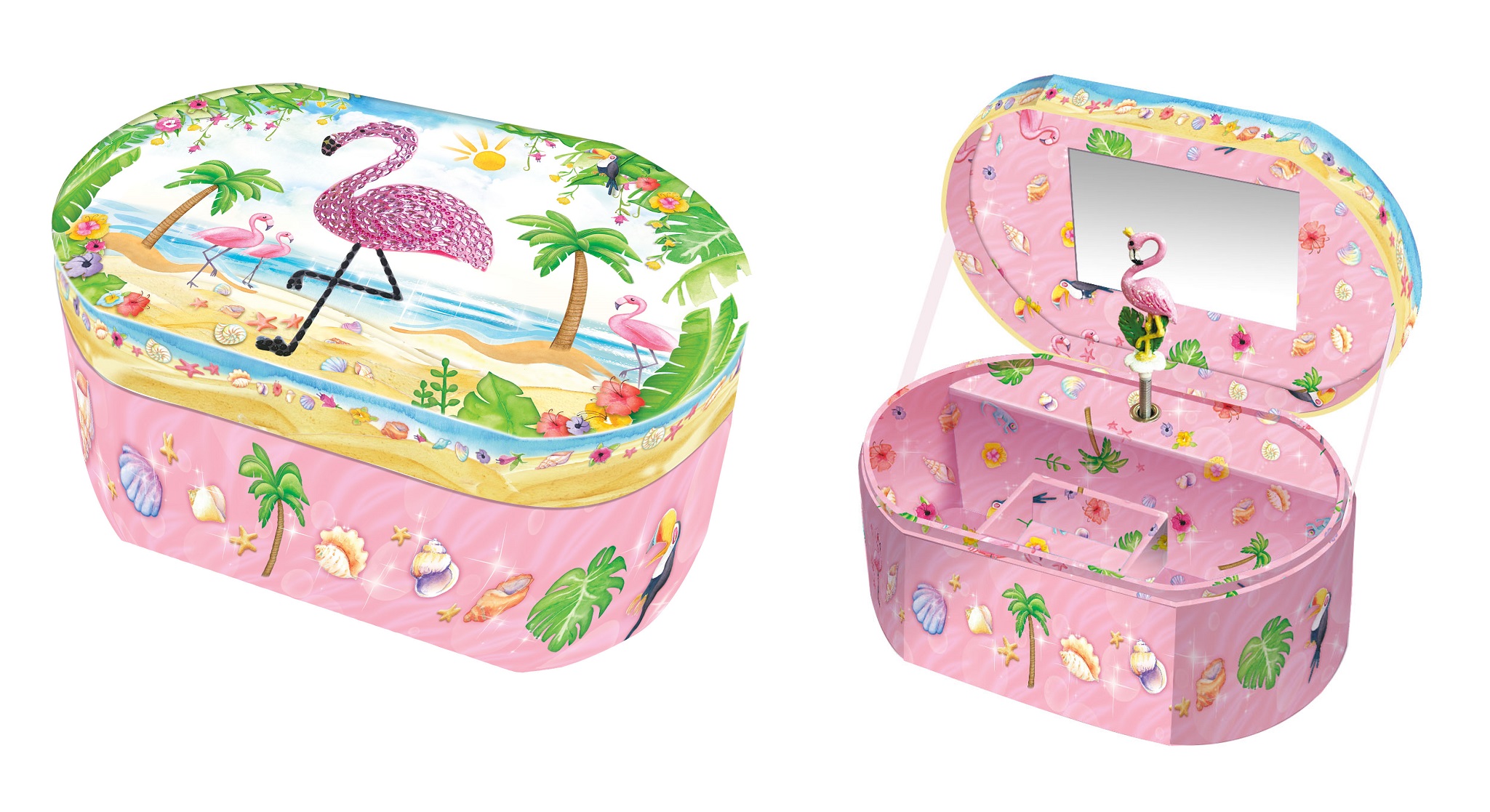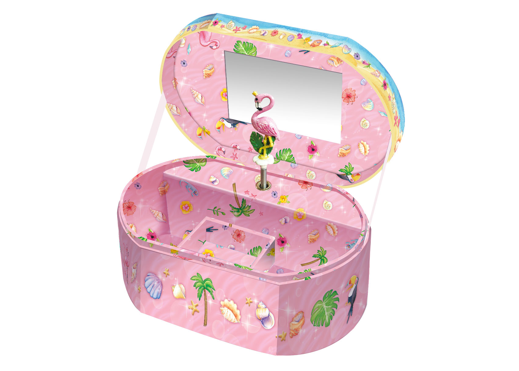 Pozytywka uruchamia się po otwarciu wieczka. Wewnątrz znajduje się lusterko, miejsce na różne drobiazgi oraz figurka flaminga kręcąca się w rytm melodii „Dla Elizy”.