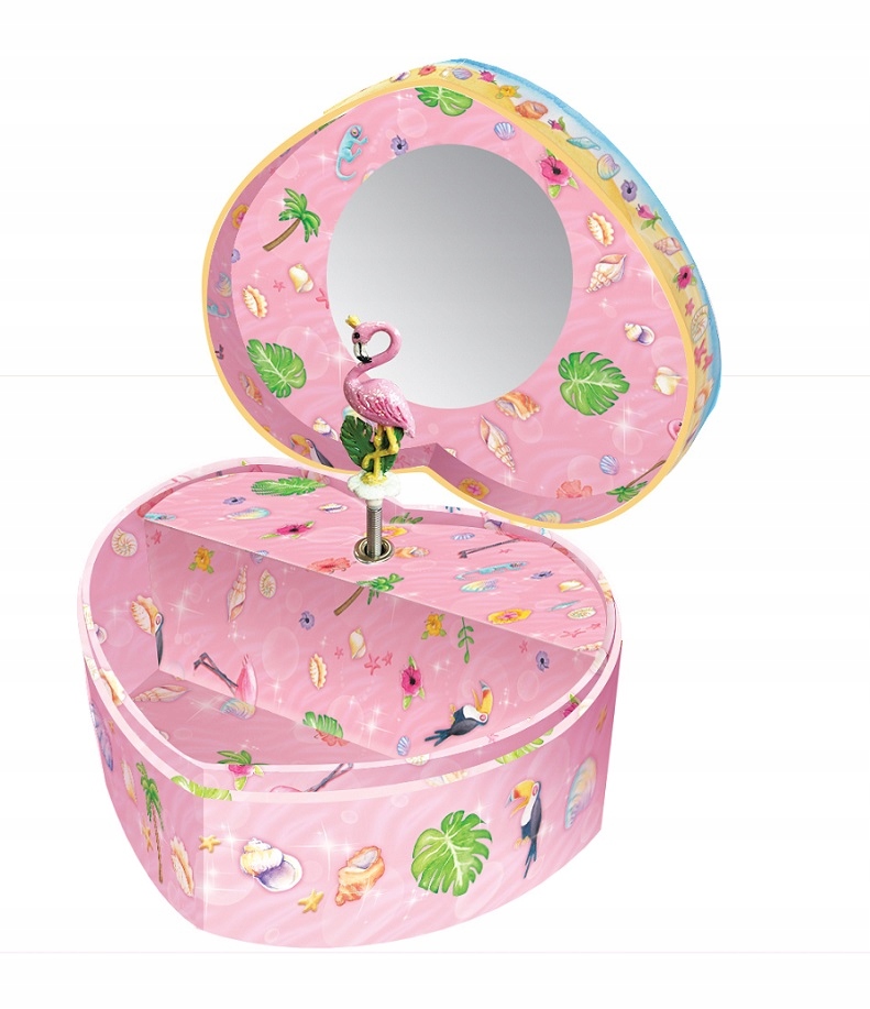 Pozytywka uruchamia się po otwarciu wieczka. Wewnątrz znajduje się lusterko, miejsce na różne drobiazgi oraz flaming kręcący się w rytm melodii „Dla Elizy”.