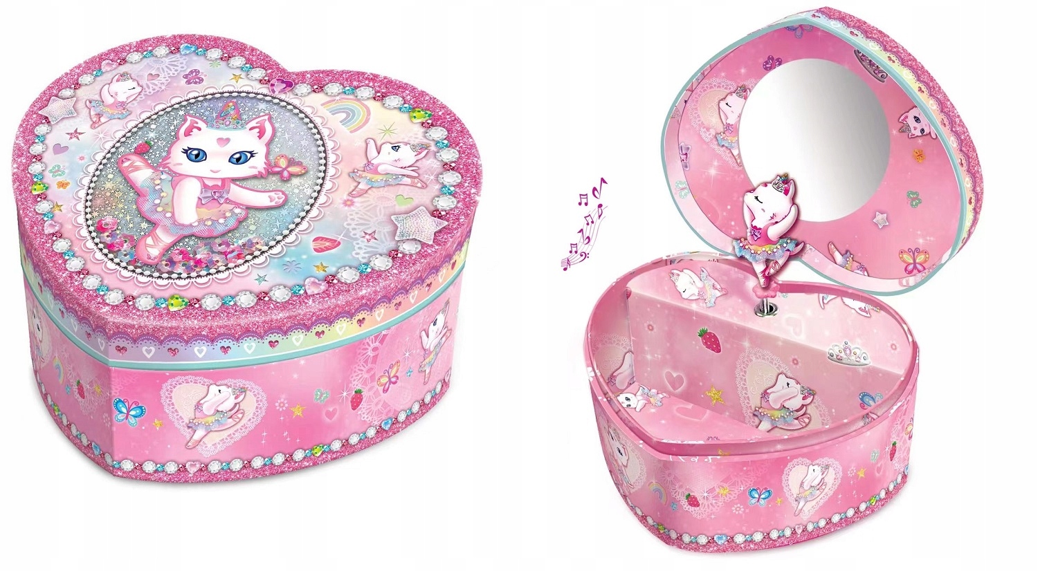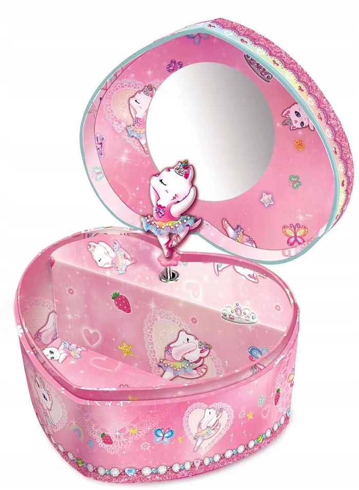 Pozytywka uruchamia się po otwarciu wieczka. Wewnątrz znajduje się lusterko, miejsce na różne drobiazgi oraz kotka baletnica kręcąca się w rytm melodii „Dla Elizy”.