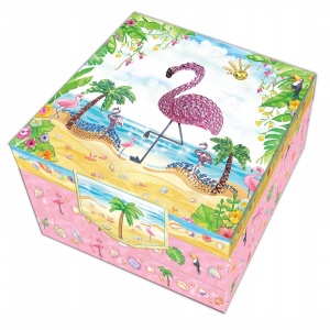 Szkatułka wykonana jest ze wzmocnionej tektury. Po otwarciu wysuwają się 2 szufladki, w których można umieścić akcesoria i dodatkowe drobiazgi. Zamykana jest na magnes. Wierzch szkatułki ozdobiony jest przesypującymi się kryształkami w okienku.