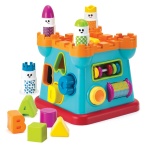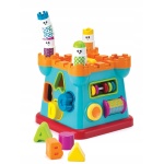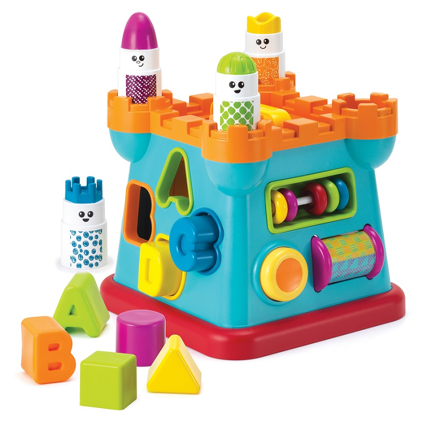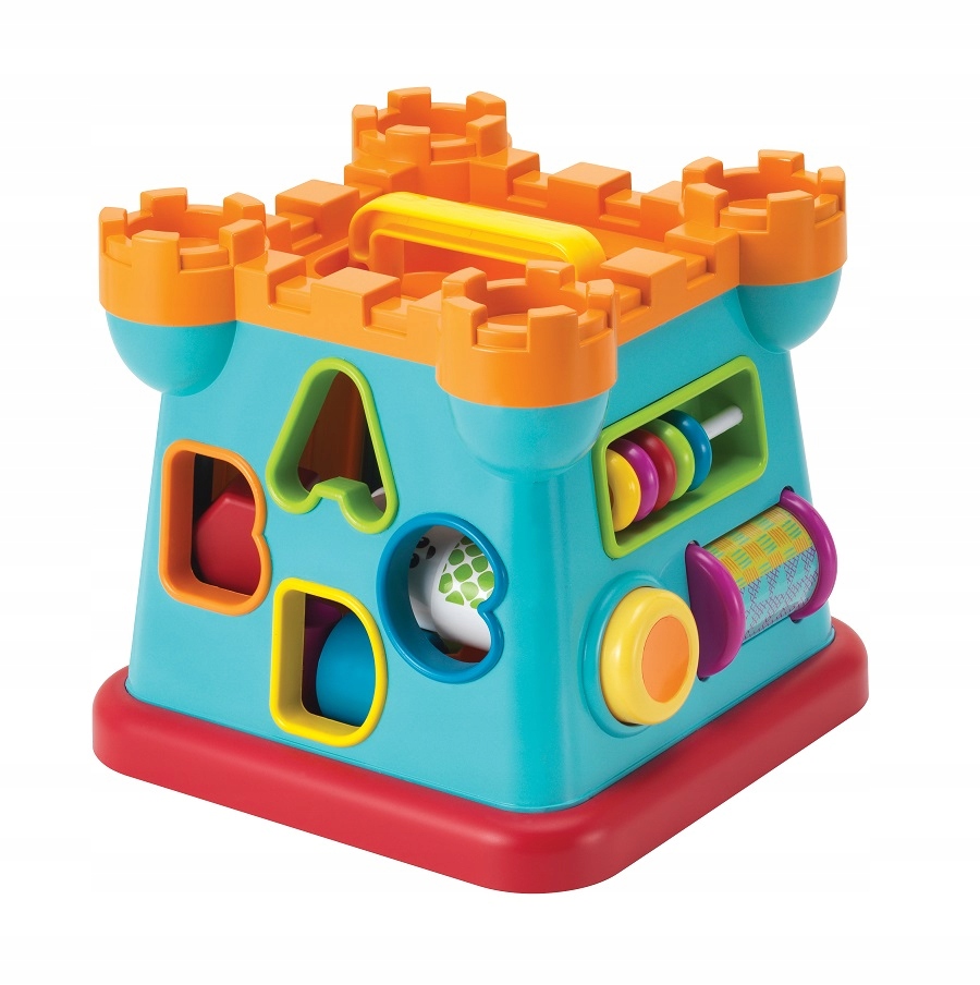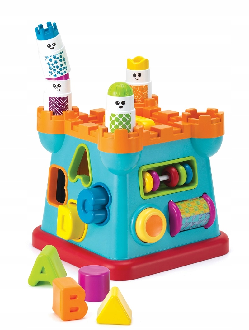 Okna i drzwi zamku to otwory, przez które można wrzucać klocki o różnych kształtach do środka zabawki. Zamek posiada żółty przycisk – piszczałkę, kolorowy walec do okręcania, ruchome koraliki oraz rączkę do łatwego przenoszenia.