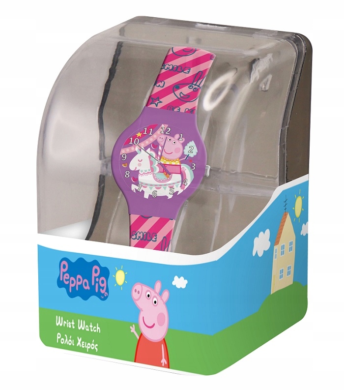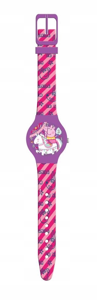Zegarek analogowy z motywem Świnki Peppy. Posiada 3 wskazówki: godzinową, minutową i sekundową. Długość zegarka z paskiem: 22,5 cm. Średnica tarczy z obudową: 3,5 cm.