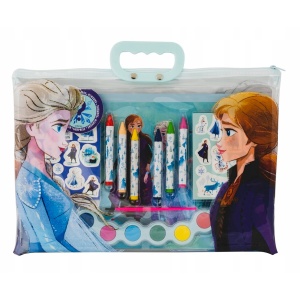 Zestaw zawiera: kolorowankę-zeszyt, arkusze z naklejkami, 6 farbek wodnych, pędzelek, 6 kredek świecowych.